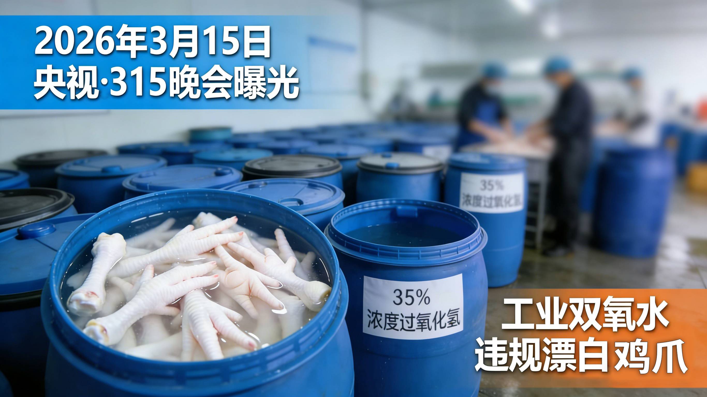 2026年3月15日晚,央视3·15晚会曝光了川渝地区部分食品生产企业为了让鸡爪卖相白净诱人,违规使用工业双氧水(过氧化氢)进行“漂白”。 据晚会报道,在某些食品企业的生产车间,记者发现大量无标识的蓝色塑料桶,桶内装着的正是用于漂白鸡爪的35%浓度过氧化氢。