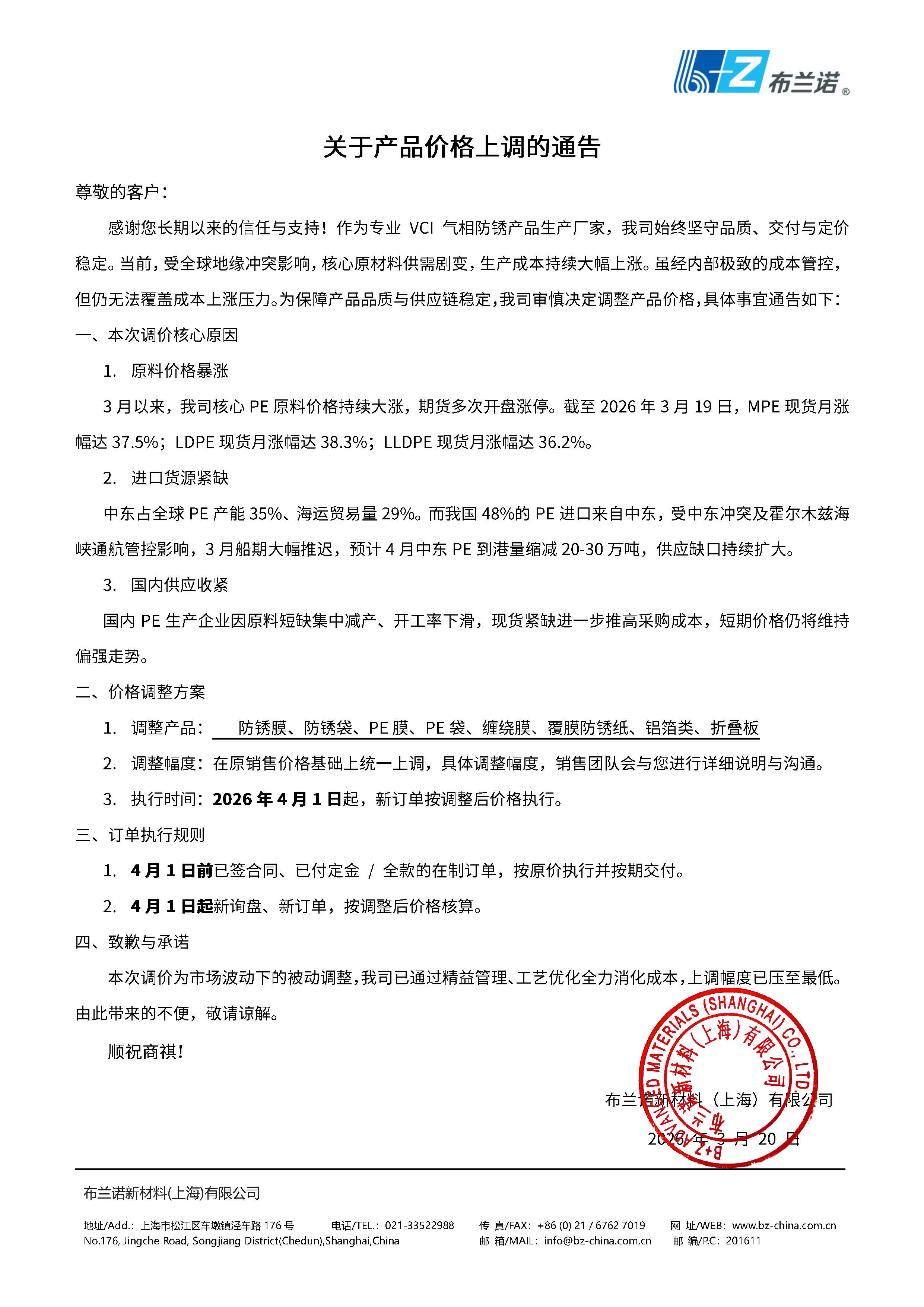 感谢您长期以来的信任与支持!作为专业VCI气相防锈产品生产厂家,我司始终坚守品质、交付与定价稳定。当前,受全球地缘冲突影响,核心原材料供需剧变,生产成本持续大幅上涨。虽经内部极致的成本管控,但仍无法覆盖成本上涨压力。为保障产品品质与供应链稳定,我司审慎决定调整产品价格,具体事宜通告如下:
